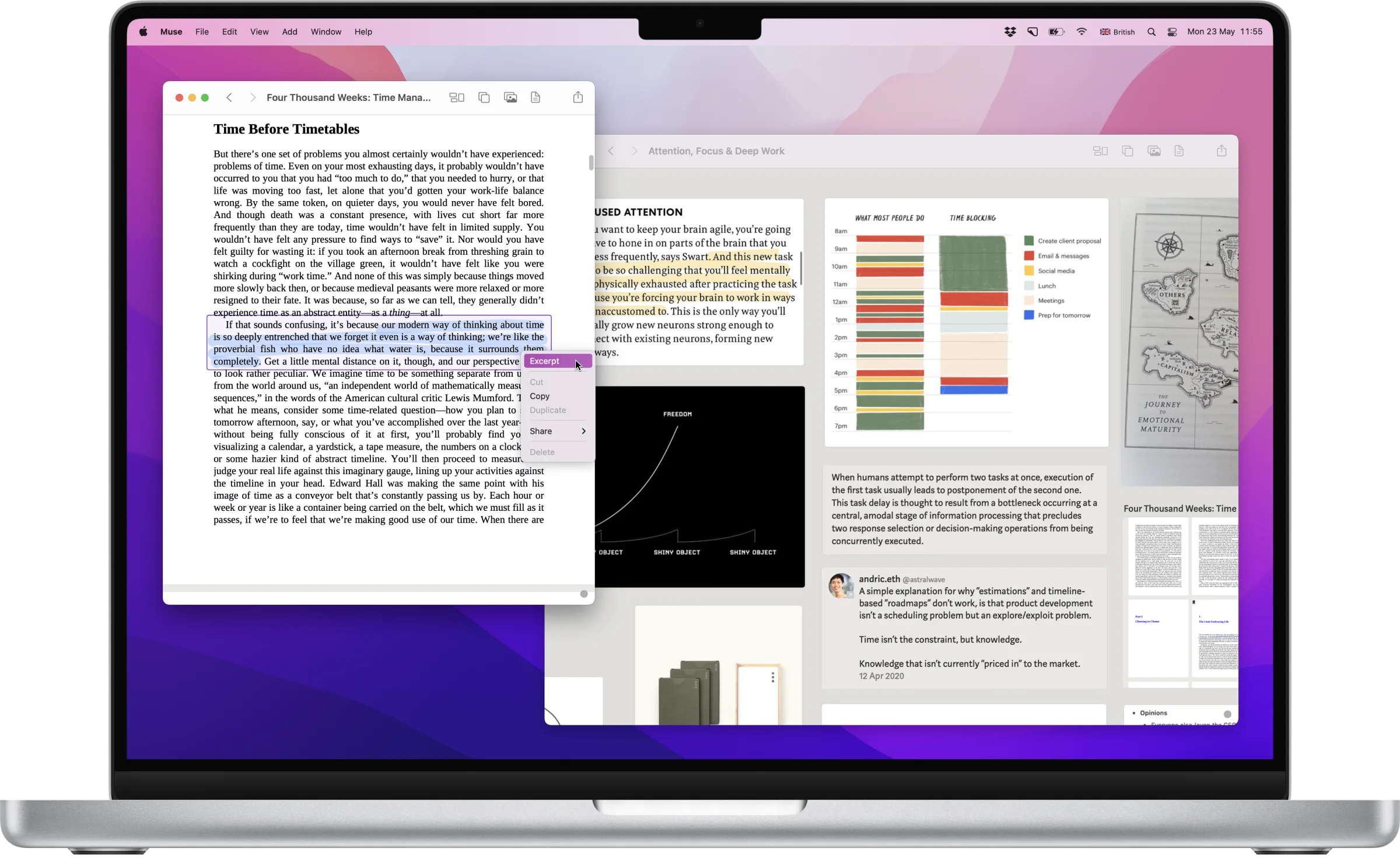 Native also gives the benefit of greater system integration. Drag-and-drop, for example, is a crucial interaction for Muse where you’re often clipping content from other apps into a board, or taking finished boards and pulling out content into your authoring tool. Electron apps, for example, often struggle to offer reasonable drag-and-drop functionality.